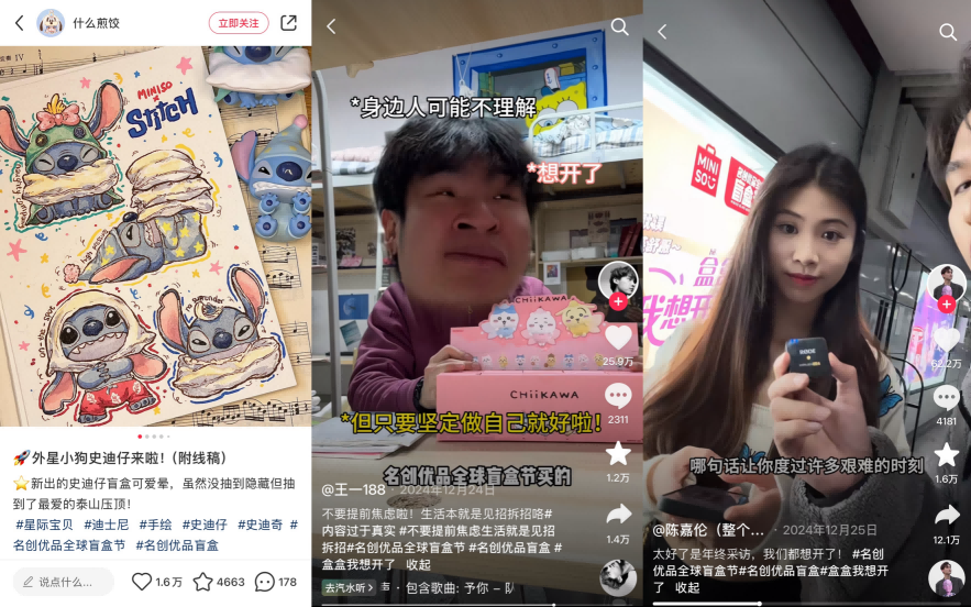 小紅書上,畫手以此次全球盲盒節(jié)為契機,分享迪士尼史迪仔系列盲盒及線稿圖,成功打造10萬+互動爆款,評論區(qū)里,來自美國、玻利維亞和菲律賓等地的網(wǎng)友紛紛表示“so cute”,也曬出自己的史迪仔;而在抖音,博主們做街訪、創(chuàng)作劇情短片,傳遞著一種“想得開、反焦慮”的情緒,涌現(xiàn)了數(shù)篇超高點贊內(nèi)容。