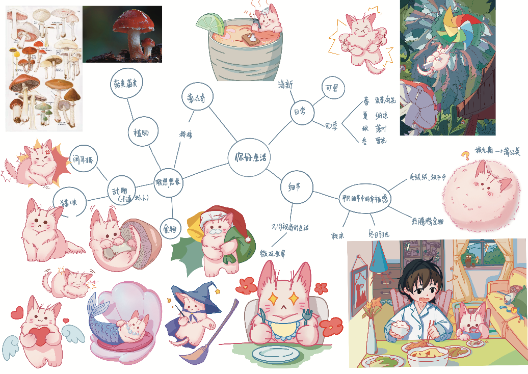 中國美術學院插畫專業(yè)學生關于《你好,生活》主題發(fā)散思維導圖“我們的同學們作品中有很多可愛的想法,有許多他們這個年齡對未來的美好向往,能夠感受到同學們在真正關注社會,關注我們的生活。”指導老師楊毅弘說。對于美好生活,不同的同學也給出了不同的演繹。美好生活,也許是享受生活樂趣的過程,也許是創(chuàng)造個人價值與社會價值的過程。